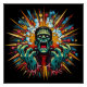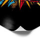 Uma representação vibrante de um monstro com boca aberta e mãos levantadas é colocada contra uma explosão explosiva de listras e pontos coloridos. A composição dinâmica transmite entusiasmo e energia.