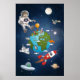 O que está acontecendo ao redor do planeta Terra, uma visão do espaço. Poster com foguete, astronauta, satélite, lua, etc...