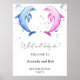 Menino ou Menina. Azul ou Rosa. Pink de aquarela e golfinhos azuis com gênero revelam festa. A festa reveladora de gênero é decorada com bolhas de água.