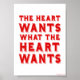 Esta poster de 5 x 7 mostra a citação de Emily Dickinson, "O coração quer o que o coração quer" em vermelho em branco.