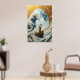 Um velho num pequeno barco pesca numa onda gigante com uma lua grande no fundo. Ele está vestido de túnica branca e segurando uma vara de pesca. A onda está se espalhando ao seu redor, mas ele parece inabalável.