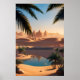 O quadro retrata uma paisagem serena do deserto com um vibrante oásis azul no primeiro plano. Palmeiras enquadram a paisagem, sua folhagem esverdeada verde contrasta com as dunas de areia quente. O céu é azul suave, o que indica uma atmosfera pacífica e calma. À distância, aumenta um aglomerado de formações rochosas, acrescentando um senso de mistério e grandeza à paisagem.