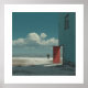 A surreal picture of a man in a suit who stands staring out at the ocean, near a large building on the sand with it's door open as if this is where the man emerged from.