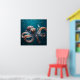 Arte na parede do oceano. Esta imagem mostra um polvo hiperrealista com uma aparência de vidro nadando no oceano profundo. Escolas de peixes iridescentes e tartarugas marinhas natações atrás dela, todas fundidas com texturas intricadas e ultra-detalhadas.