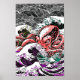 Este trabalho de arte dinâmico e impressionante representa um enorme polvo batalhando contra uma onda de torres. O polvo, rendido em tons vibrantes de rosa e roxo, é mostrado com seus tentáculos estendidos, lutando contra a força da onda. A própria onda é representada num padrão giratório de linhas brancas e pretas, criando um sentido de movimento e caos. O estilo geral do trabalho de arte é ousado e gráfico, com clara influência dos tradicionais impressões de madeira japoneses.