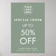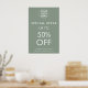 Destaque sua promoção com nosso poster verde sábio. Ideal para anunciar ofertas especiais e vendas finais, ele ganha atenção e promove seu evento ou venda com eficiência.