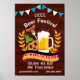 Convite para o festival de cerveja Oktoberfest com uma caneca de cerveja, pretzel, salsicha, faixa de fita com as cores da bandeira alemã, bandeiras bávaras no topo para celebrar Oktoberfest no outono.