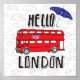 Alô, cartaz em Londres com guarda-chuva, ônibus vermelho e bandeira do Reino Unido em forma de coração em nuvens. | © e ® Bigstock® - Todos os direitos reservados.
