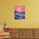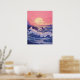 Uma paisagem sazonal de tirar o fôlego banhada no brilho suave de um sol de pôr. O oceano azul profundo inchou com ondas dinâmicas, caindo contra rochas irregulares, enquanto o céu é pintado em tons de rosa e roxo. Essa composição sonhadora captura o equilíbrio entre a potência bruta do oceano e a beleza tranquila do crepúsculo.