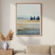 This minimalist abstract landscape artwork captures the quiet beauty of an open terrain with a distant horizon and a small cluster of trees resting in stillness. Soft horizontal layers and a wide, hazy sky create a feeling of openness and calm, while the gentle balance of cool slate tones and warm sandy accents brings warmth without visual weight.