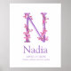 Bonito, pintada à mão na letra de monograma de cor d'água N com orquídeas selvagens cor-de-rosa torcidas em torno da letra N do nome roxo e que significa poster. Ideal para um presente personalizado para uma garota que tem um nome começando com N. Este exemplo lê Nadia Giver de esperança. Tender, atlético e bem falado ou você pode personalizar o texto com seu próprio nome e palavras significantes, se necessário. Ideal como presente especial de aniversário ou celebração. Se precisar de ajuda com seu próprio nome personalizado, entre em contato comigo. © Letra maiúscula N orquídea cronológica tipográfica branca pintada por Sarah Trett para www.mylittleeden.com
