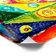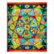 Padrões geométricos vibrantes enchem a imagem, apresentando círculos, triângulos e espirros em um caleidoscópio de cores que incluem azul, verde, amarelo e vermelho. A intrincada design cria um sentido de simetria e equilíbrio.
