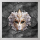 Uma máscara veneziana intricadamente projetada apresenta detalhes de ouro e branco ornamentado, colocados contra um fundo de cinza escuro rachado. Os embelezamentos da máscara incluem delicado filigre e joias brilhantes.