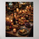 A lavish candlelit feast overflows across an intricately patterned table with glowing red wine, fresh grapes, apples, pears, crusty bread, and colorful ornate platters piled high with savory dishes. Warm golden candlelight and soft bokeh create an opulent, celebratory atmosphere full of rich textures and inviting abundance. This sumptuous digital artwork captures the magic of a bohemian-style gathering, perfect for canvas prints, posters, throw pillows, mugs, mousepads, and home décor that brings luxurious warmth and festive energy to any space.