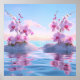 Orquídeas rosa delicadas florescendo em pequenos montes arenosos que se elevam acima de águas calmas e reflexivas. O fundo apresenta um céu com gradiente suave com tons suaves de azul, rosa e indícios de formações de nuvens, criando uma atmosfera tranquila. As orquídeas, com suas pétalas vibrantes e variações sutis de tonalidade, adicionam um toque de elegância e beleza, perfeitamente espelhado na superfície da água, reforçando a sensação geral de tranquilidade e harmonia na cena.