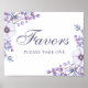 Sinal de casamento "Favores, por favor, peguem um" com flores roxas.