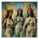 A.I. criada impressão surreal de Três Deusas Gregas antigas conhecidas como Moirai ou as 3 Irmãs do Destino. Eram a personificação do destino -: Clotho (o espinheiro), Lachesis (o aletéter) e Atropos (o inevitável, uma metáfora para a morte), vestida de vestes e coroas ornamentados fluentes.