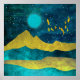 design de paisagem da montanha abstrato em tons de ouro, ciano e azul em tons negros, com um nascer, estrelas e pássaros.