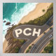 This stylized aerial illustration captures the iconic Pacific Coast Highway as it curves along the coastline, blending natural beauty with graphic creativity. The winding road forms bold “PCH” lettering directly within the composition, guiding the eye through turquoise ocean waves, sunlit sand, and lush coastal hills. With a cinematic perspective, clean lines, and vibrant coastal tones, this artwork celebrates travel, movement, and the timeless allure of California’s most famous highway.