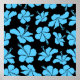Padrão sem costura do Havaí brilhante com flores de hibisco tropicais sobre fundo preto em cores azuis. abstrato, aloha, arte, fundo, preto, flor,azul,botânico,califórnia,decor,tecido,moda,floral,flor,vestuário,gráfico,hawaiano,hibisco,feriado,vintage,ilustração,retro,