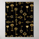 Padrão perfeito de chaves antigas, douradas e silhuetas em fundo preto.