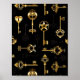 Padrão perfeito de chaves antigas, douradas e silhuetas em fundo preto.