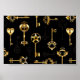 Padrão perfeito de chaves antigas, douradas e silhuetas em fundo preto.