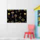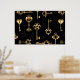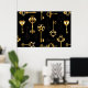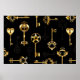 Padrão perfeito de chaves antigas, douradas e silhuetas em fundo preto.