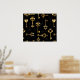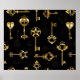 Padrão perfeito de chaves antigas, douradas e silhuetas em fundo preto.