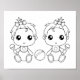 Meninas bonitas de desenho animado em macacões com bíblias de estrelas correspondentes segurando batalhas de bebês. A bola de brinquedo está descansando entre eles. Feita para uma coloração fácil.