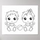 Bebês bonitos de desenho animado, menino e menina, em macacões com bíblias de estrelas correspondentes segurando batalhas de bebês. A bola de brinquedo está descansando entre eles. Feita para uma coloração fácil.