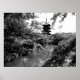 Fotografia em preto e branco de uma ascensão de pagode japonesa sobre um belo jardim com um lago. A cena é no Templo Toji em Kyoto, Japão. O pagode é um símbolo de Kyoto.
