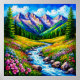 Cenário alpino colorido com fluxo fluente, flores silvestres e montanhas majestosas sob um céu azul vibrante. Uma descrição serena e pitoresca da beleza e tranquilidade da natureza.