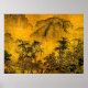 Esta bela poster de arte apresenta uma impressão de uma antiga paisagem oriental. Duas figuras pequenas caminham pelas árvores em direção a um pagode no primeiro plano. As montanhas ficam à distância. As cores do outono são ouro, amarelo, laranja, verde, marrom e preto.