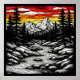 Belo trabalho de arte paisagístico preto-e-branco com um rio que flui através de árvores e montanhas sob um céu ensolarado vívido e multicolorido, demonstrando harmonia e serenidade da natureza.