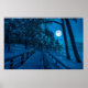 Paisagem de inverno com pinheiro e abetos cobertos de neve em lua à noite estrelada com lua de cheio. Vista de floresta de coníferas com caminho de madeira perto da costa marítima com belo céu noturno com estrelas.