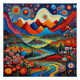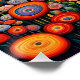 A I.A. criou a interpretação de uma paisagem brilhante e vibrante surreal, psicodélica, apresenta colinas rolantes, montanhas e padrões circulares abstrato representando flores.