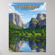 Uma ilustração pitoresca do Parque Nacional de Yosemite, mostrando penhascos granitos em torre, árvores verdes exuberantes e um rio sereno refletindo o céu.