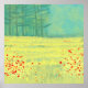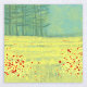 Uma pintura moderna e contemporânea com uma flor pacífica encheu o campo de verão com pássaros voando contra o céu e uma floresta de pinheiros à distância. Cores frescas e elevatórias amarelas e verdes. Arte original de Nic Squirrell.