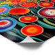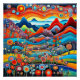 A I.A. criou a interpretação de uma paisagem brilhante e vibrante surreal, psicodélica, apresenta colinas rolantes, montanhas e padrões circulares abstrato representando flores.