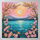 Paisagem serena realçada por cores vibrantes e detalhes intrincados. No centro, uma lua cheia brilha suavemente contra um céu pastel, transitando do rosa para o pêssego. Ladeando a lua estão montanhas distantes, adicionando profundidade à cena.