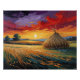 La paleta cromática se incendia con naranjas intensos, rojos vibrantes y dorados, contrastando con las sombras frías del crepúsculo. El diseño transmite una poderosa sensación de serenidad, melancolía y quietud rural. Perfecto para los admiradores del arte que buscan paisajes cargados de emoción y color.