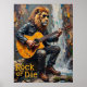 Esta pintura cativante apresenta um leão, cheio de óculos escuros e uma jaqueta de couro, profundamente mergulhado em um "palco da natureza" em um violão acústico. Ele está balanceado em um tronco ao lado de uma cachoeira que flui e um riacho azul. A vibrante e texturizada escova cria uma atmosfera viva e entusiasmante, transmitindo perfeitamente a vibração "Rock or Die" deste concerto ao ar livre único
