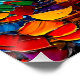 Uma paisagem vibrante apresenta um pequeno barco em um rio colorido, cercado por árvores com folhagem brilhante no outono. O céu é uma mistura quente de amarelos e laranjas, com montanhas visíveis à distância.