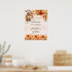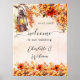Um poster de boas-vindas para um casamento outono. Um fundo rosa dourado, cor-de-rosa-claro. Decorado com uma lanterna vintage e flores laranja. Personalize e adicione uma data e seus nomes.