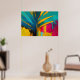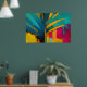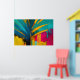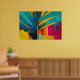 Esta vibrante obra de arte abstrata canaliza o espírito ousado dos trópicos através de formas amplas semelhantes a palmeiras e cores de alto contraste. Folhas de um azul profundo e oceânico cortam dramaticamente um fundo radiante de dourado, magenta, turquesa e amarelo quente, criando uma sensação de movimento, calor e luz solar. Pinceladas expressivas, gotas e camadas texturizadas dão à peça um caráter bruto e enérgico que parece vivo e inequivocamente moderno.