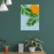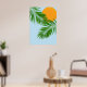 Esta poster apresenta um elegante design minimalista com um sol tropical atrás de folhas de palma sobre um fundo azul-céu.