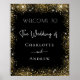 Um fundo preto, decorado com faxes de brilho dourado. Com o texto: Bem-vindo ao Casamento de... Personalize e adicione seus nomes.