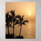 Silhuetas de palmeiras contra o céu do pôr do sol.