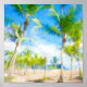 Linda arte decorativa de palmeiras de aquarela. Design apresenta árvores grandes e pequenas com céu azul e nuvens brancas. Praia está longe das árvores com água azul. Se você gosta deste design em outro produto, entre em contato conosco em karuna@karunaskreations.com.